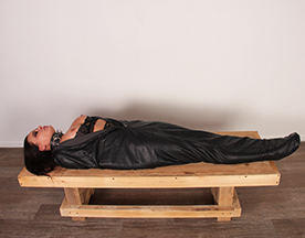 To find out if Tindra Frost is flexible, I strapped her in this small armbinder. She is great! Tindra did not really like being this vulnerable and helpless, completely nude for anyone to grab, but she did not have any problems with the tight armbinder. She tried to struggle out of it, but it wasn’t possible. Now I know she is very flexible, I can do more extreme positions with her! She won’t be happy about that!